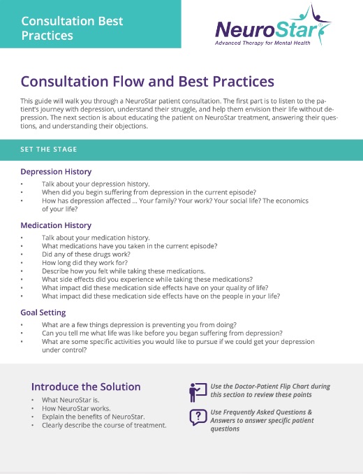 Access the 5-STARS to Success program here with the full library of training and support materials. The 5-STARS to Success is a proven formula to help grow your practice by transforming the lives of more patients with depression. Your dedicated NeuroStar Practice Consultant can help you implement these steps to create a smooth and sustainable system to attract and treat more patients with NeuroStar.